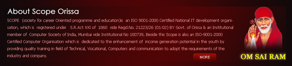 SCOPE (society for career Oriented programme and education)is an ISO 9001:2008 Certified National IT development organisation, which is registered under S.R.Act XXI of 1860 vide Regd.No. 21223/26 (01-02) BY Govt. of Orissa & an Institutional member of Computer Society of India, Mumbai vide Institutional No 100739, Beside this Scope is also an ISO 9001:2008 Certified Computer Organisation which is dedicated to the enhancement of income generation potential in the youth by providing quality training in field of Technical, Vocational, Computers and communication to adopt the requirements of the industry and company. The mission of ISO is to promote development of standardization and related activities in the world with a view to facilitating the international exchange of goods and servicesand to developing the co-operation in the sphere of intellectual, scientific technological and economic activities. ISO means The international Standardization for Organisation ISO is a trademark which gives you a shape to your Career,conceptual studies with best faculties which give the best direction.ISO certified Organisation Adding value to your Certificate with a legal validity .By this certificate you can be recognized globally. SCOPE was started its Education & IT Services as a computer institute in the year 2001-2002 with a mission to spread the awareness about the necessity of computer education in our daily life & to create a group of trained professionals. We got a lot of appreciation from the mass for spreading computer literacy in the state of orissa.